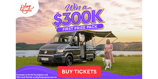 The long-time supporters’ First Prize Pack from Play For Purpose Raffle 19, drawn Friday 16 June 2023, includes a Volkswagen Crafter Kampervan and more than $100,000 in gold bullion.