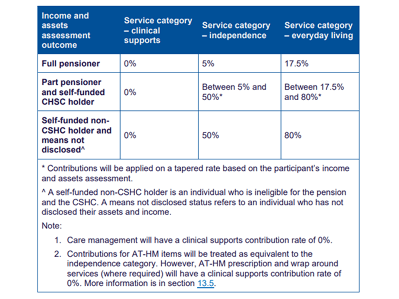 While no one will have to pay clinical supports (e.g. nursing care, allied health), contributions will be required for independence services (e.g. personal care like showering, social support, therapeutic services, respite, transport and assistive technology) and everyday living services (e.g. domestic assistance, home maintenance and meals).